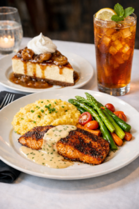Provided dinner will be blackened salmon with Charleston cream sauce, aged cheddar and gouda grits, and fresh seasonal vegetables, followed by a Bananas Foster cheesecake topped with whipped sour cream.